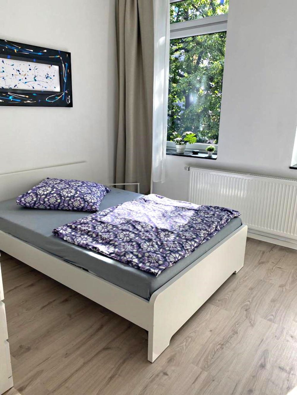 Modern flat in the centre on the corner of Schadowstraße/ Grafenberger Allee. A bright, contemporary and lovingly furnished flat on the 1st floor with lift in a completely newly renovated apartment building. Open kitchen with counter, equipped with electric cooker, ceramic hob, fridge and microwave. Living room with corner sofa (sofa bed), flat screen TV and TV table. Floor-to-ceiling windows, the 3.2m high ceilings, smoothly plastered walls, ceiling washlights and the modern furnishings harmonise wonderfully and offer a sense of space and living comfort.