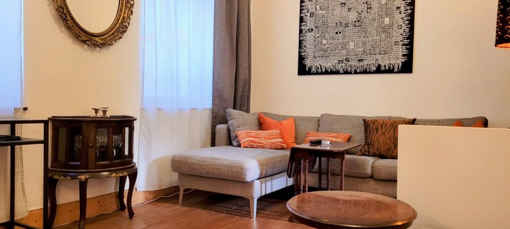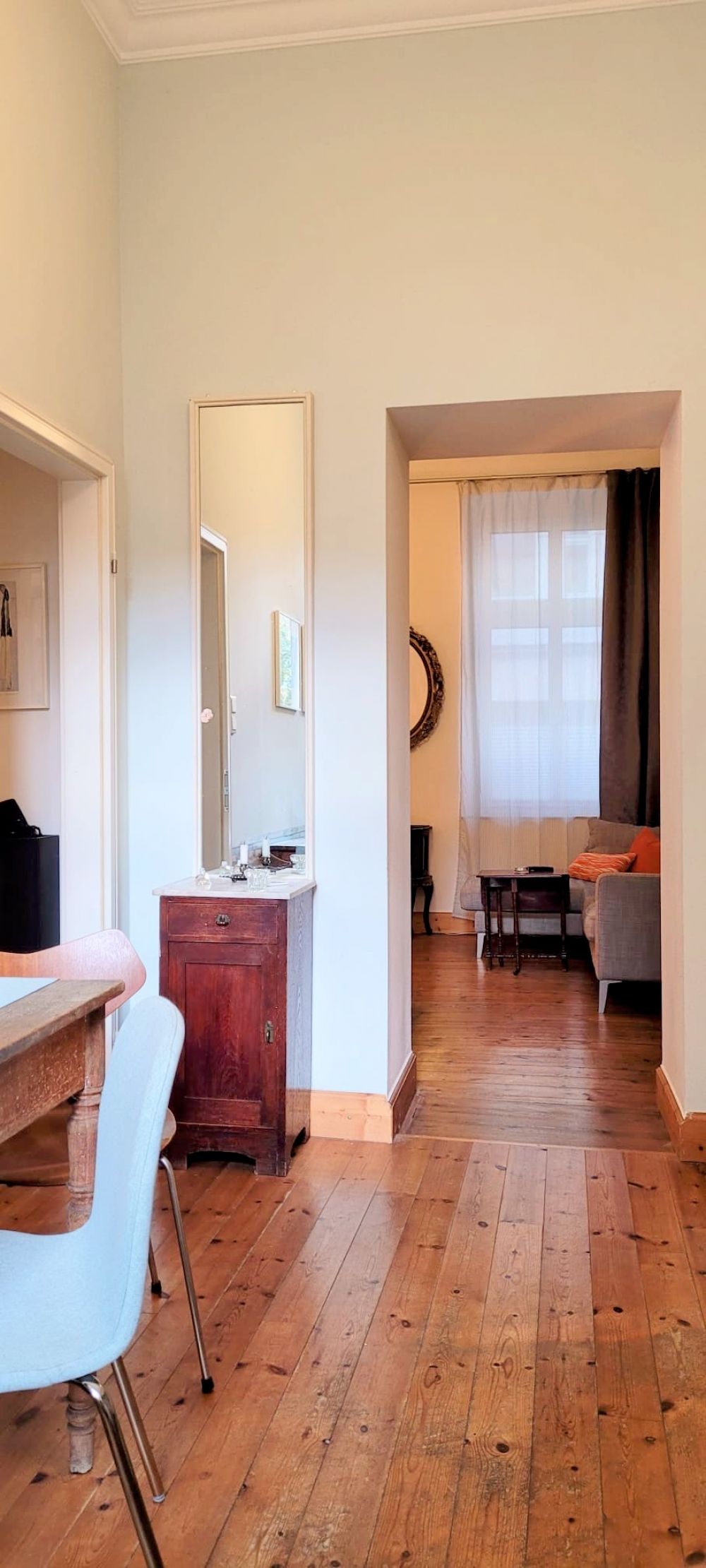 The apartment features typical period high ceilings with decorative stucco and wooden plank flooring, creating a charming and elegant atmosphere.