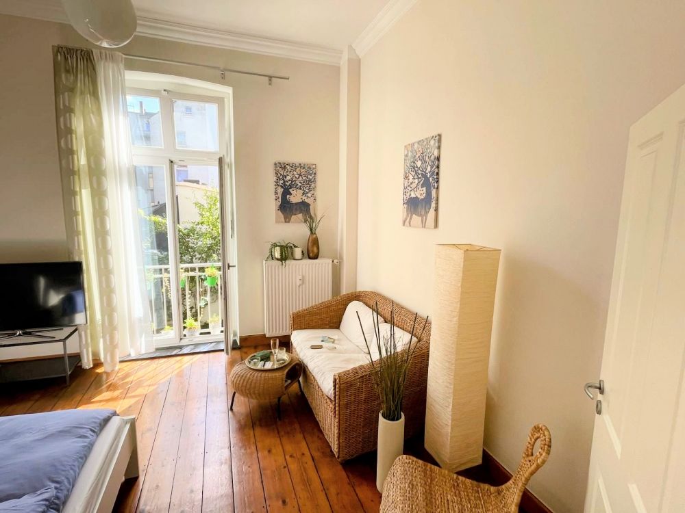 Beautiful apartment in a completely renovated architect-designed building, located in a quiet side street off Lorettostraße. Typical period features such as high ceilings with decorative stucco and wooden floorboards create a charming atmosphere. The apartment faces the quiet rear courtyard.