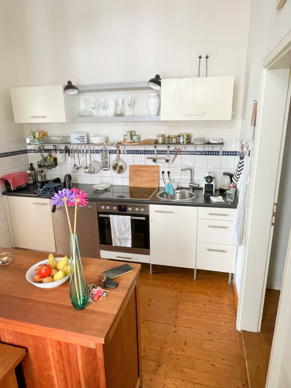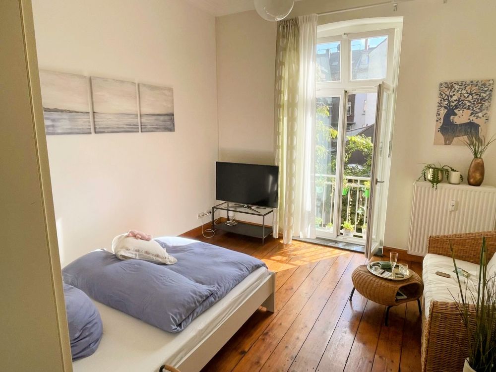 Unterbilk/ Medienhafen: Schöne Wohnung eines komplett sanierten Architektenhauses in ruhiger Seitenstraße der Lorettostrasse. Altbau-typisch hohe Decken mit Stuck. Holzdielenboden. Ruhig zum hinteren Innenhof gelegen. Wohn-schlafraum mit gemütlicher Fernseh-Ecke mit Couch und Kleiderschrank. Die separate Küche ist mit sämtlichen Geräten ausgestattet, sowie einem großen Esstisch, der auch als Schreibtisch genutzt werden kann.