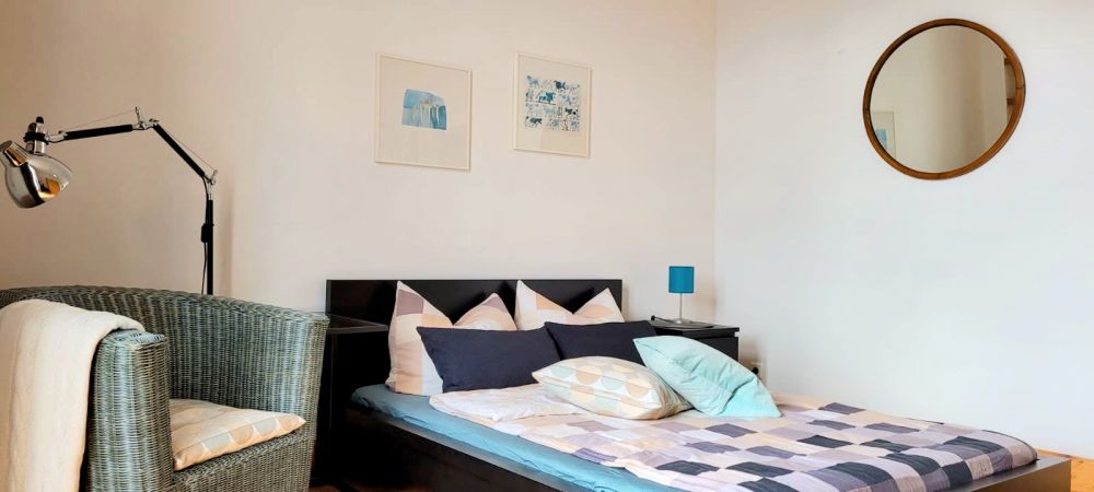 Typisch für den Altbau-Charme überzeugen die Wohnung durch hohe Decken mit Stuck sowie einen schönen Holzdielenboden. Der helle Wohn- und Schlafraum ist mit einem Doppelbett, einer gemütlichen TV-Ecke mit Couch sowie einem Kleiderschrank ausgestattet. Bodentiefe Fenster sorgen für viel Tageslicht und ein angenehmes Wohnambiente.