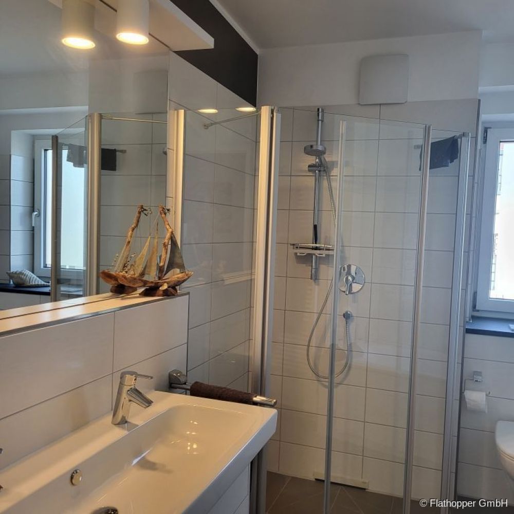 Die Wohnung besteht aus zwei Schlafzimmern, ein Badezimmer mit großer Dusche und Badewanne, sowie ein separates Gäste WC.