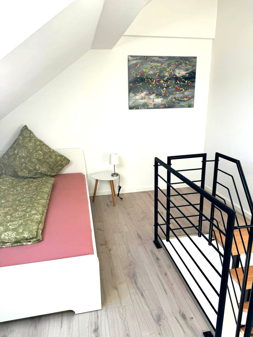 Obere Ebene: Separates Schlafzimmer mit Doppelbett und Einbauschrank. Die helle Wohnung besticht durch hohe Decken, Parkettboden, glatt verputze Wände, in allen Räumen integrierten Halogenspots, und einer freundlichen Möblierung, die für eine angenehme Wohlfühlatmosphäre sorgen. W-LAN ist inklusive. Strom ist separat zu zahlen. PKW-Stellplatz in unmittelbarer Umgebung.
