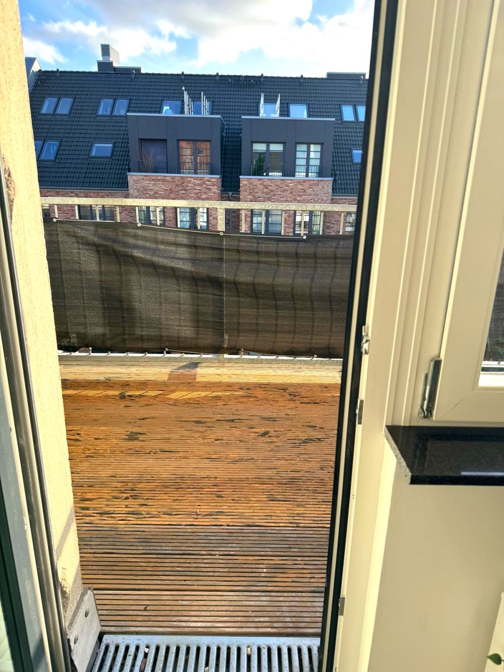 Untere Ebene: Wohnraum mit angrenzender, voll ausgestatteter Küchenzeile mit integrierter Waschmaschine. Wohnzimmer mit Zugang zum großzügigen Balkon mit Markise. Neues Badezimmer mit bodentiefer, verglaster Dusche.
