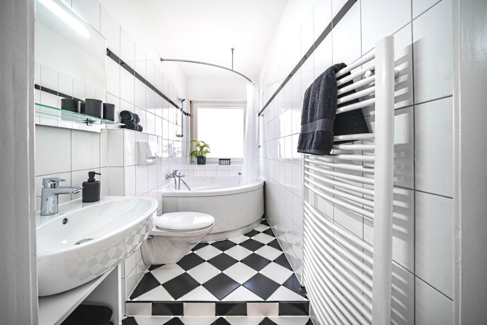 - weiß gefliestes Bad mit Eckbadewanne