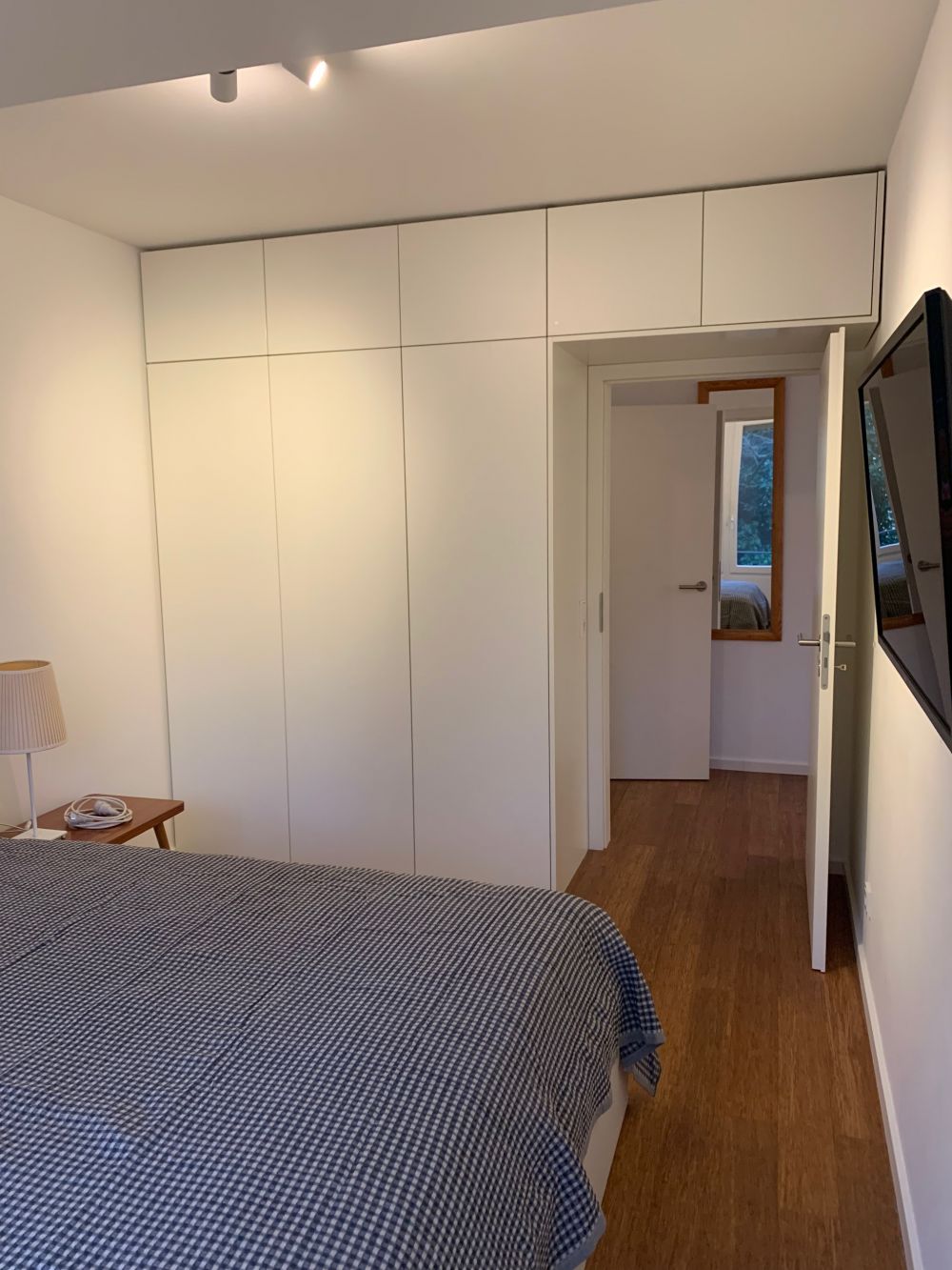 Das Schlafzimmer ist mit einem neuem 1,60 m breitem Bett eingerichtet und einem maßgefertigtem Einbauschrank in weiß mit Bettzeug- und -wäsche sowie automatisiertem Sonnen- und Insektenschutz an der Fensterfronten.