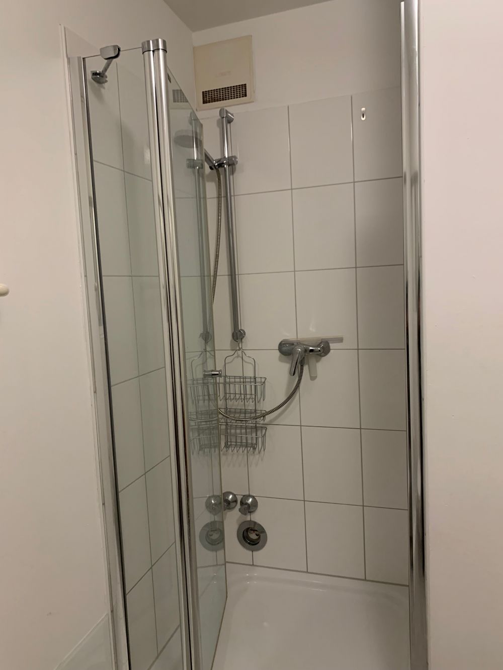 Das Bad ist ausgestattet mit einem Waschtisch auf maßgefertigtem Naturholzunterschrank, durchgehendem Spiegel, Ablageflächen, darüber Einbauschrank mit integrierter Beleuchtung, Dusche mit Glastüre, WC, Hewi-Sanitärobjekte, Handtücher inclusive.