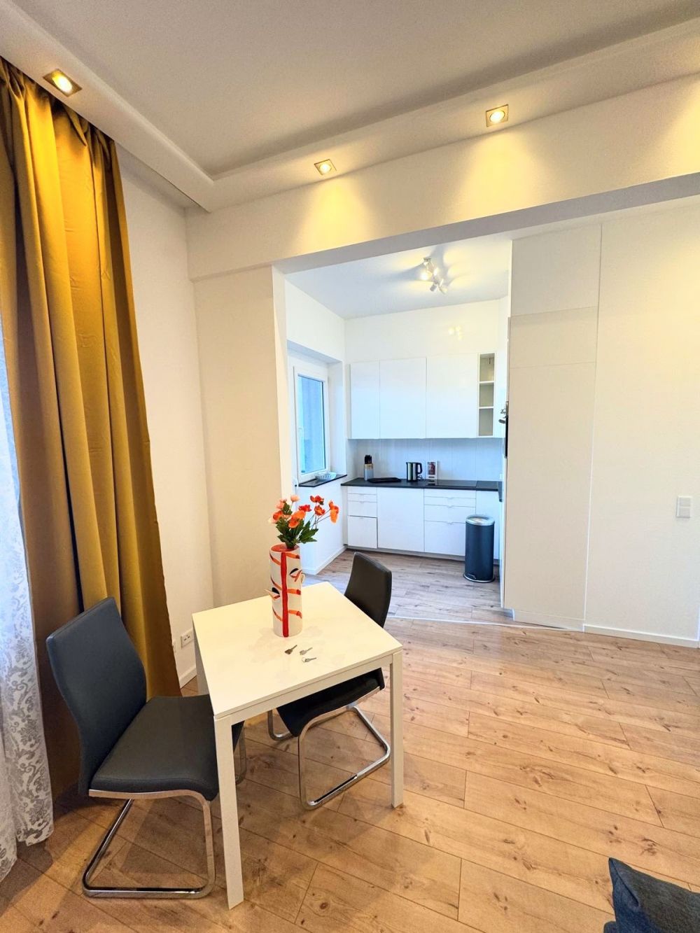 The thoughtfully designed layout and bright, friendly atmosphere give the apartment a special charm. The living area features a pull-out sofa bed and is directly connected to the fully equipped kitchen with an integrated washing machine. From the kitchen, there is access to a quiet 7 m² balcony overlooking the inner courtyard, offering a wide and peaceful view.