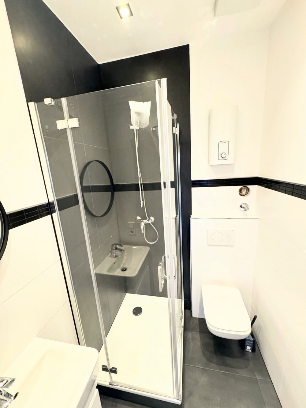 The separate bedroom is also quiet and courtyard-facing, furnished with a comfortable double bed and a practical built-in wardrobe. The newly designed bathroom is modern and features a shower.