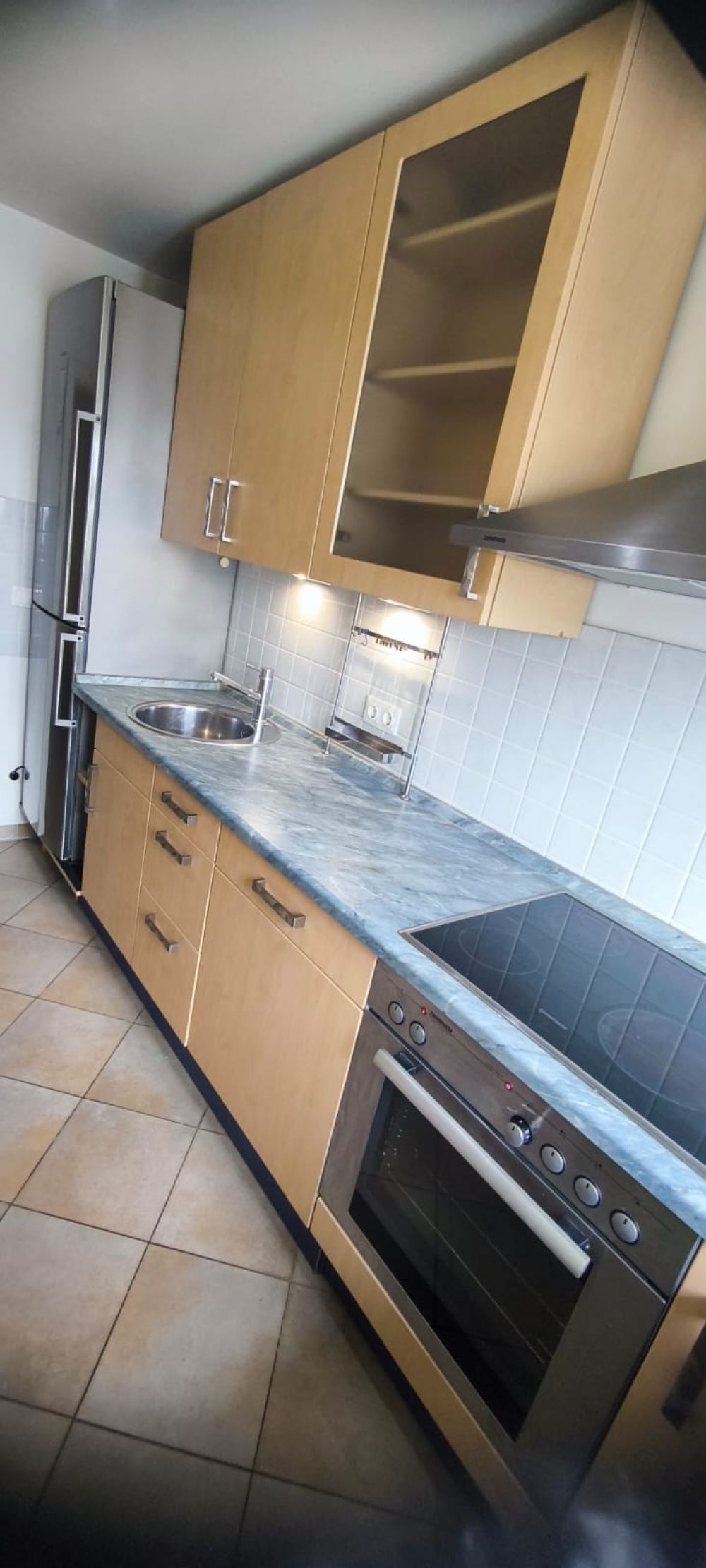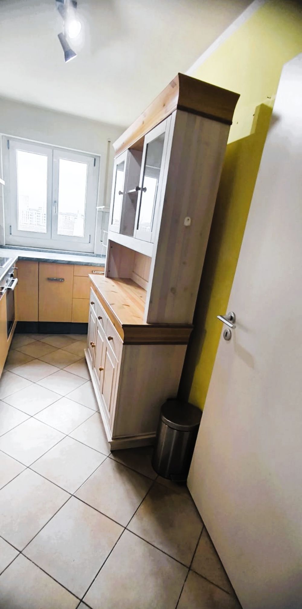 Eine Einbauküche ist inklusive Backofen, Cerankochfeld, Geschirrspüler und Kühl- und Gefrierkombination. Ein zusätzlicher Geschirrschrank ist ebenfalls vorhanden.