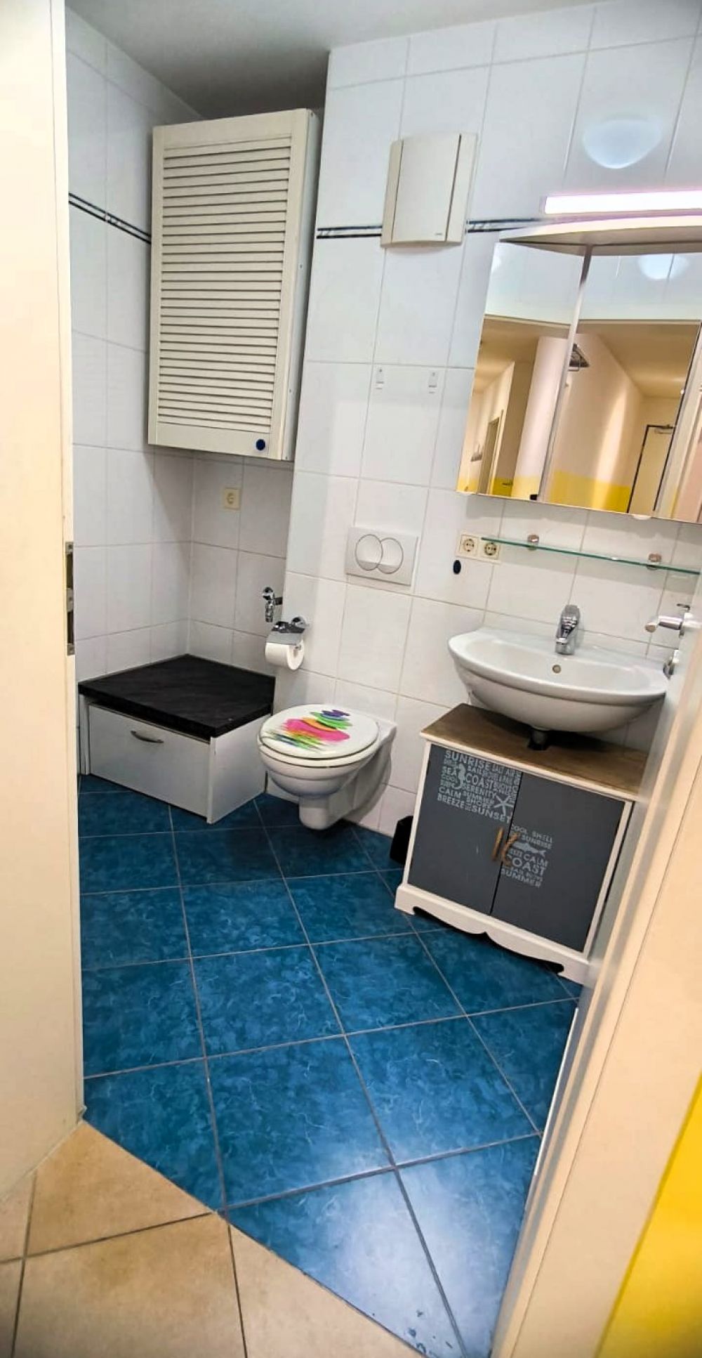 Ergänzt wird das Bad durch einen Waschtischunterschrank, Hängeschrank mit viel Stauraum über dem Waschmaschinenplatz und ein schmalen Hochschrank.