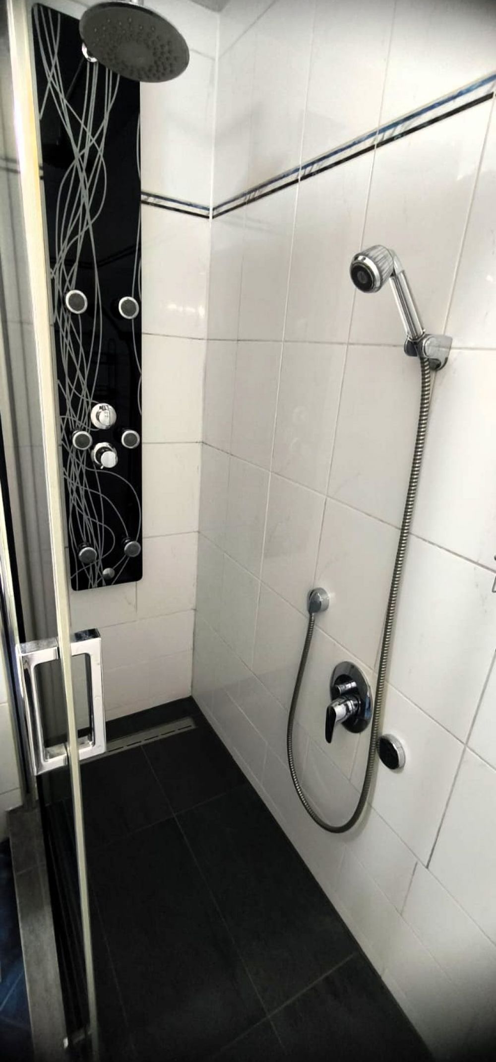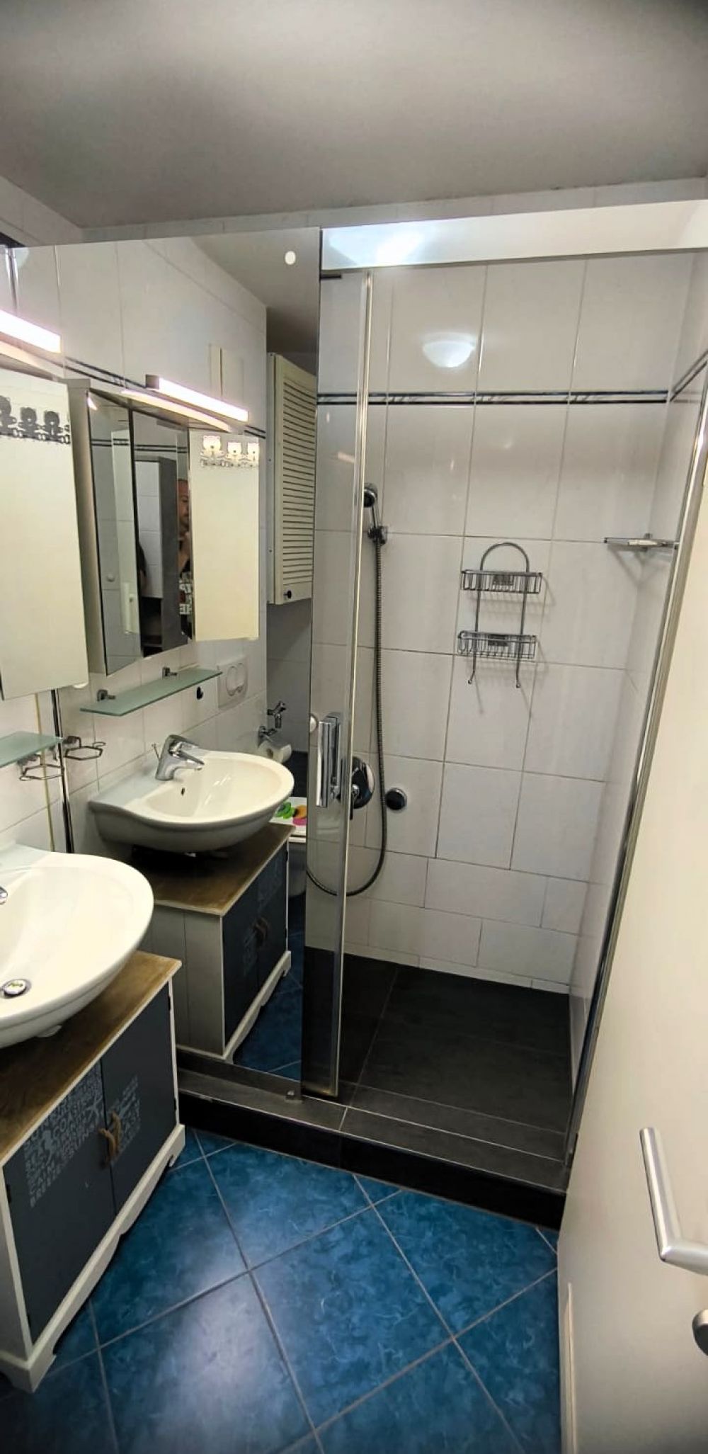 Im Badezimmer ist eine begehbare Dusche mit einer halbverspiegelten Duschwand mit Schiebetür und einer Regendusche.