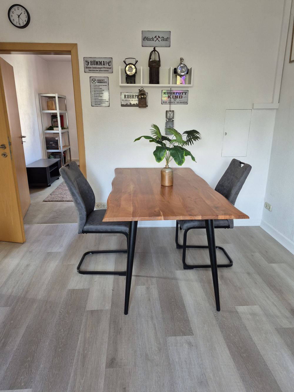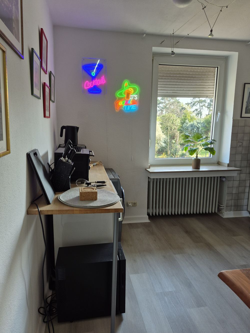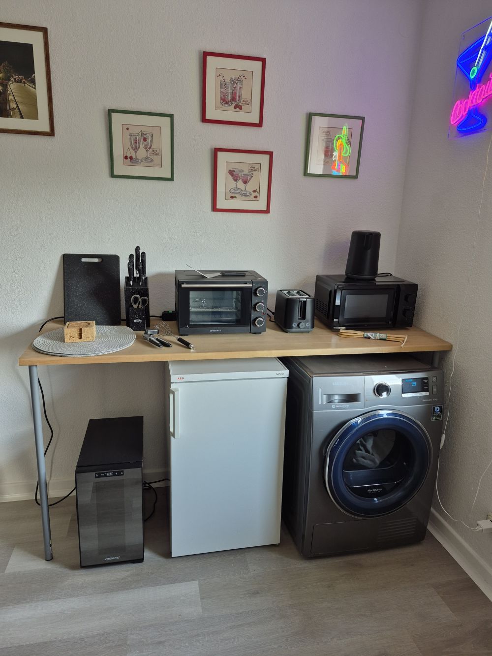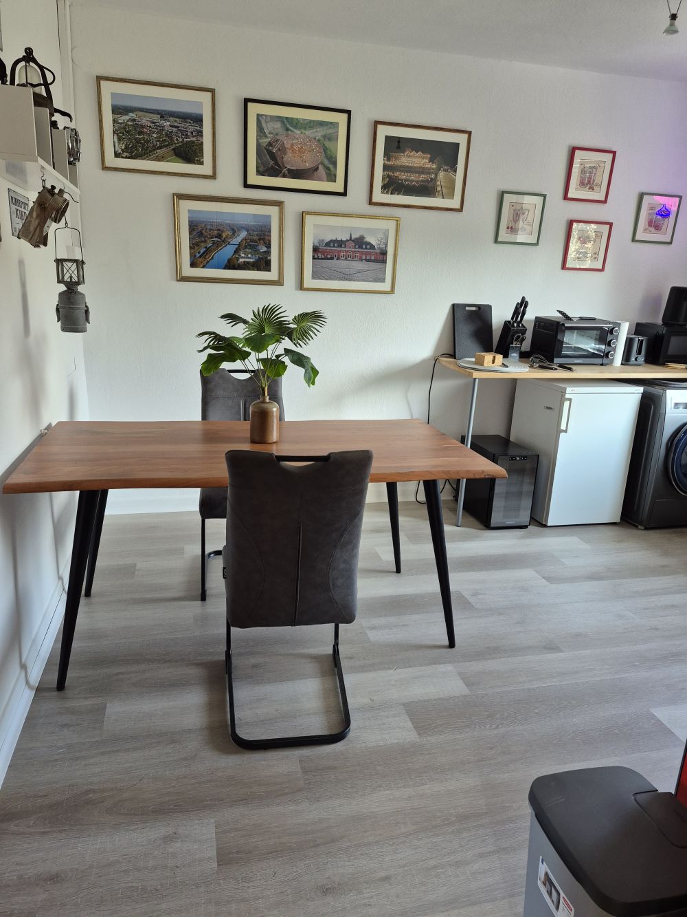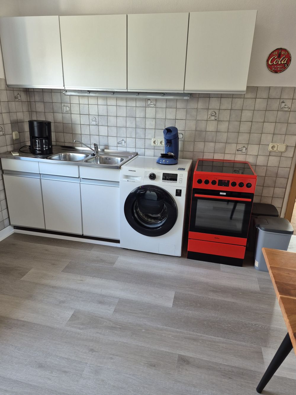 Die voll ausgestattete Küche bietet eine großzügige Doppel-Edelstahlspüle und moderne Elektrogeräte: Waschmaschine, Trockner, Herd mit Backofen und Cerankochfeld, Kühlschrank, Mikrowelle, Mini-Backofen sowie einen Weinkühler. Ergänzt wird die Ausstattung durch Wasserkocher sowie Pad- und Filterkaffeemaschine. Geschirr, Töpfe und sämtliche Küchenutensilien sind neu und vollständig vorhanden. Ein neuer Boden in moderner Betonoptik rundet das Gesamtbild ab.