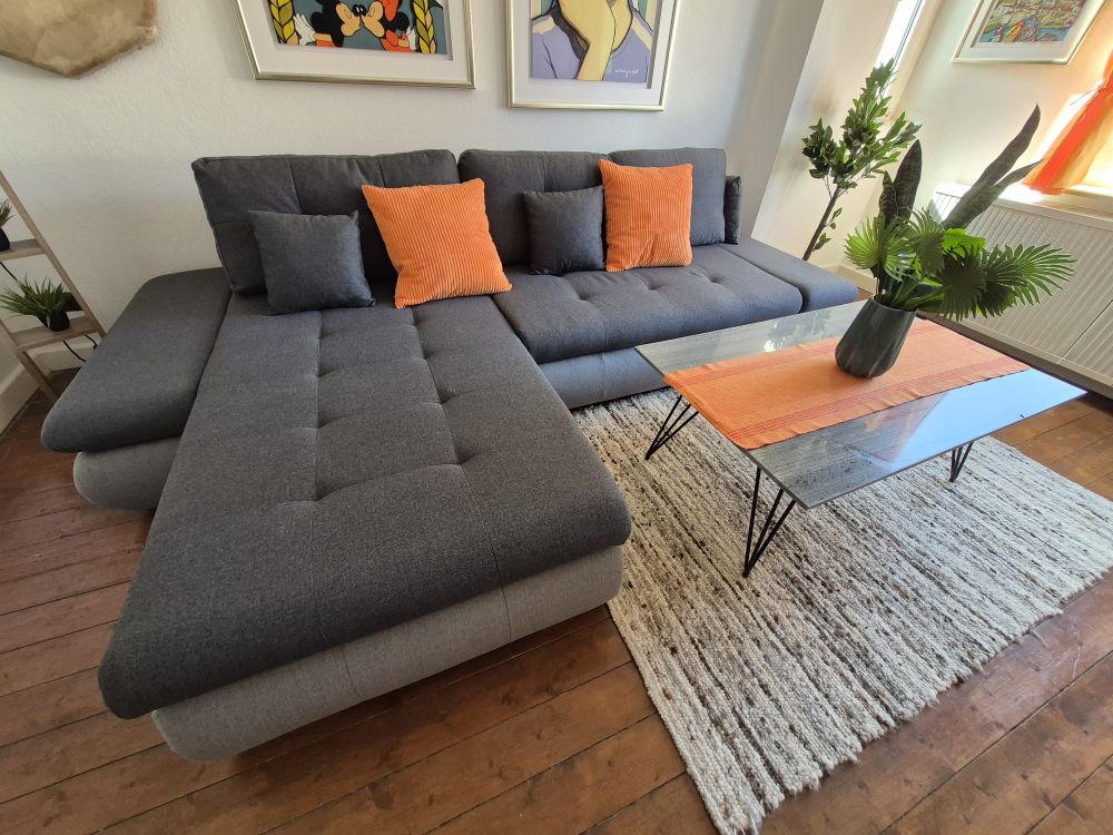 Das neu eingerichtete Wohnzimmer besticht durch eine hochwertige Wohnwand und eine gemütliche Schlafcouch mit Chaiselongue. Für Unterhaltung sorgen ein Großbildfernseher und eine Stereoanlage. Eine XXL-Kuscheldecke lädt zum Entspannen ein. Schnelles WLAN mit bis zu 100 Mbit/s ist ebenfalls vorhanden.