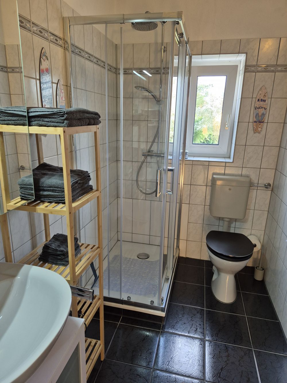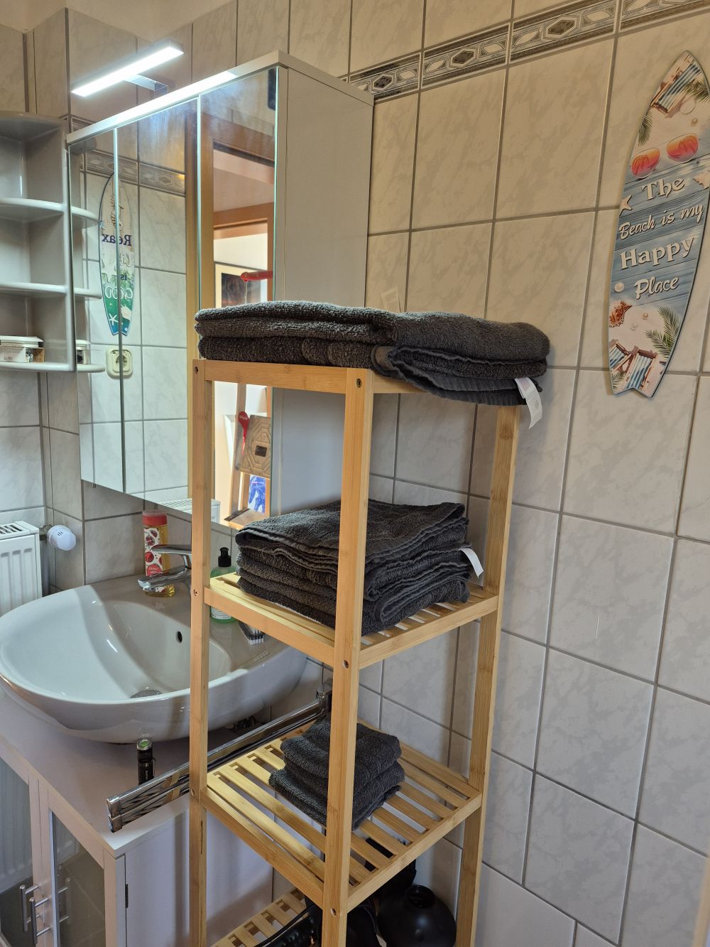 Das stilvoll gestaltete Badezimmer verfügt über eine Glas-Duschkabine sowie einen großen, beleuchteten Spiegelschrank. Zusätzlich stehen Regale mit Handtüchern sowie praktische Utensilien wie Föhn und Maniküre-Set zur Verfügung.