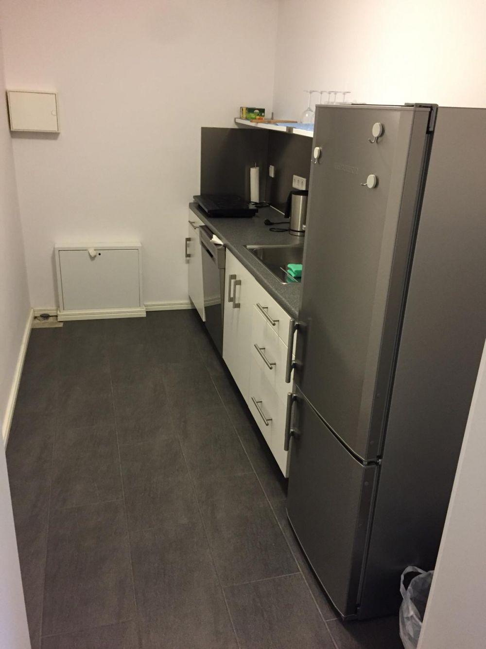 In der modernen Küche befinden sich hochwertige Elektrogeräte, sowie ein großer Kühlschrank.