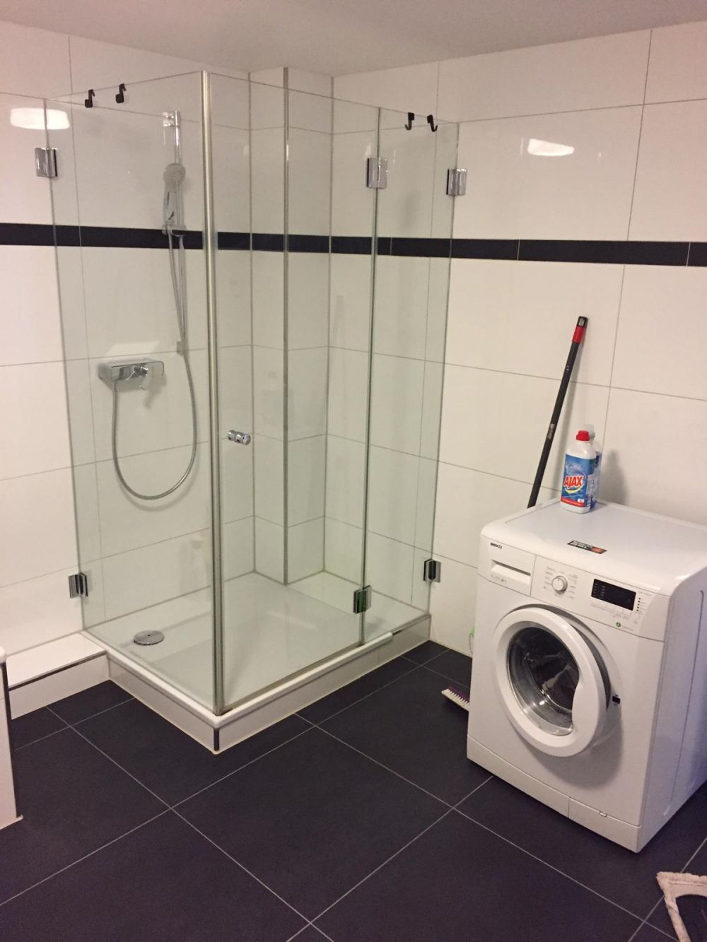 Der Boden des Badezimmers ist mit anthrazitfarbenen Fliesen gefliest. Die Wände mit großen, weißen Fliesen. Die Waschmaschine befindet sich im Badezimmer.