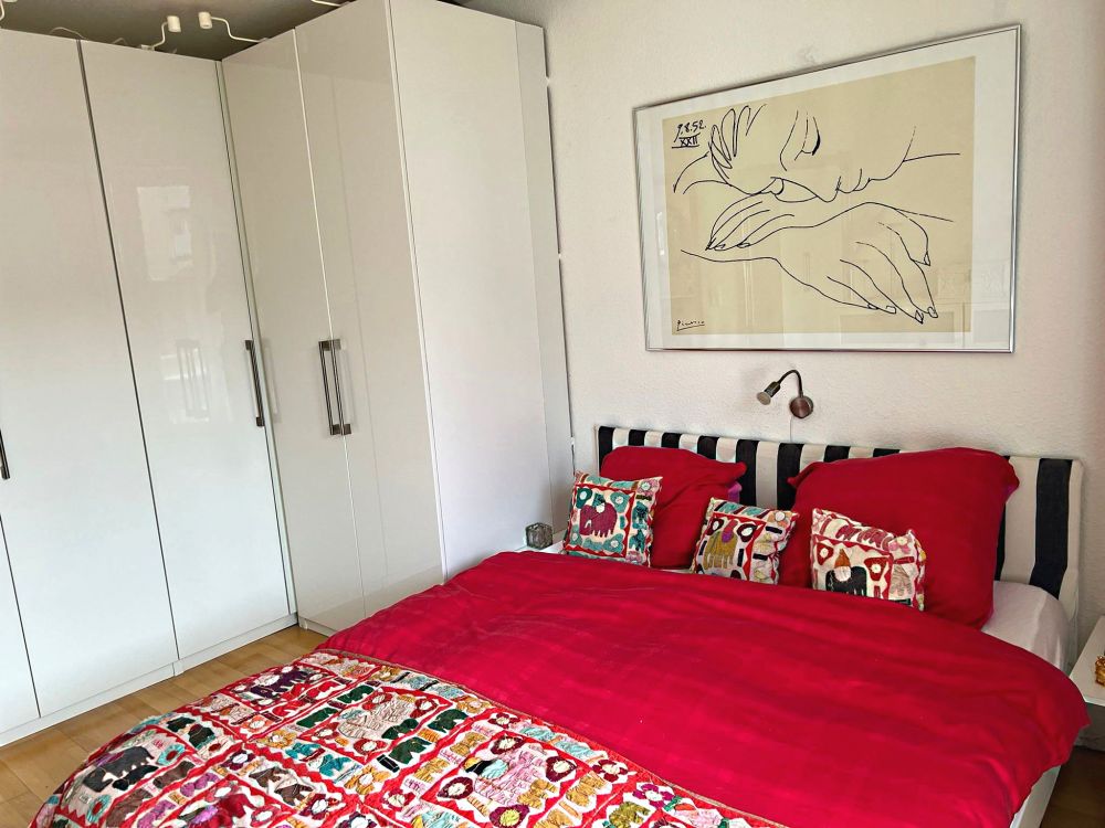 Das zum ruhigen Innenhof gelegene Schlafzimmer bietet Zugang zum Balkon und schafft eine angenehme Rückzugsmöglichkeit. Ein weiteres Schlafzimmer ist mit zwei Einzelbetten ausgestattet und verfügt über einen über die gesamte Breite integrierten Schreibtisch – ideal als Gästezimmer oder komfortables Homeoffice.