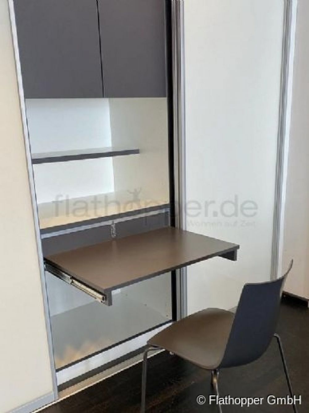 Im Essbereich ist ein separater Laptoparbeitsplatz eingerichtet. In einem Einbauschrank versteckt sich somit ein Büro mit ausziehbarem Schreibtisch und Ablagefächern.
