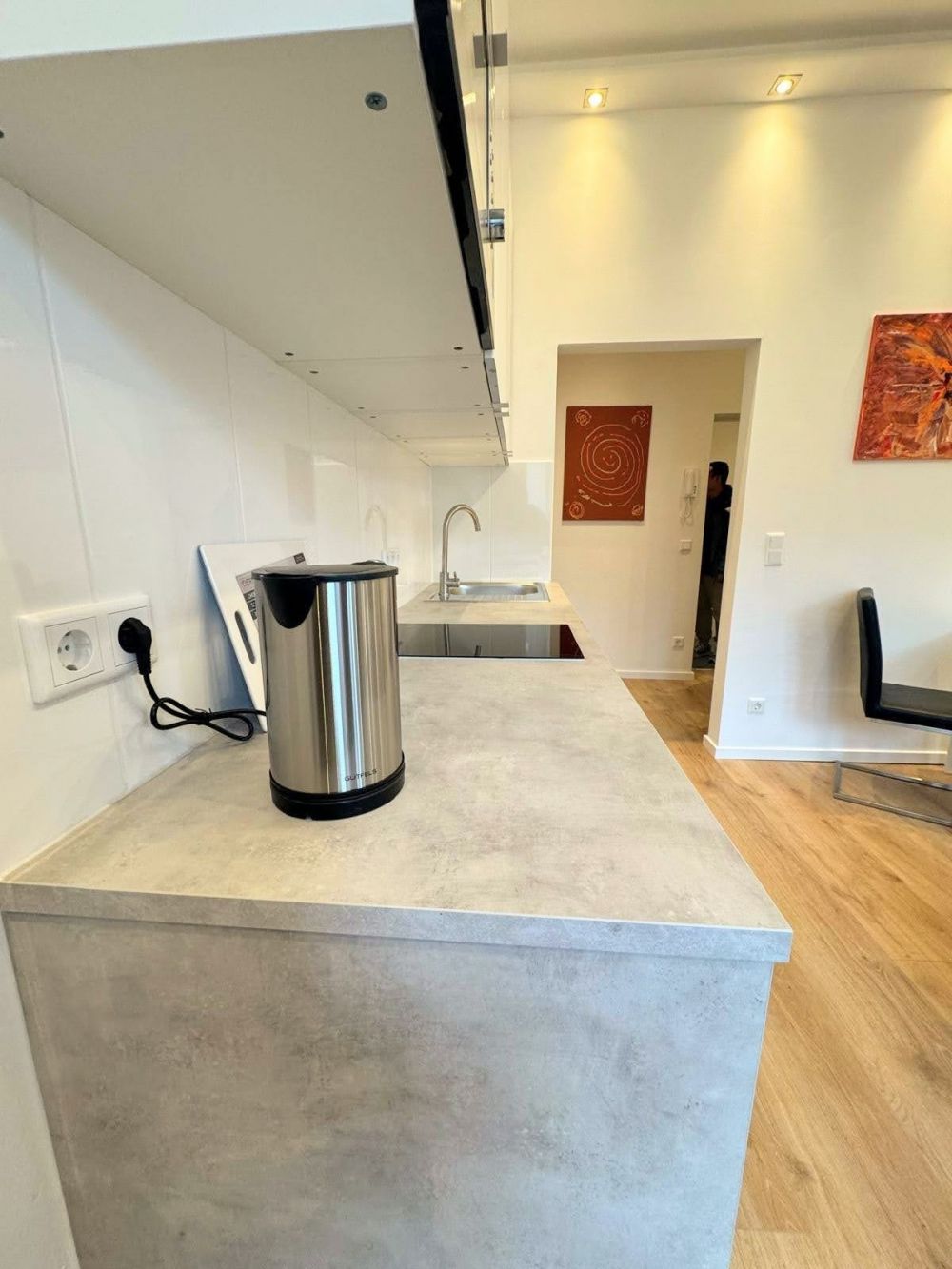 Fürstenwall: This recently completely renovated and modernly furnished and newly equipped apartment is located in a well-kept apartment building in the center of Düsseldorf in a beautiful residential street with old trees. The apartment is flooded with light and impresses with its good layout. Living room with adjoining, fully equipped kitchenette with integrated washing machine.