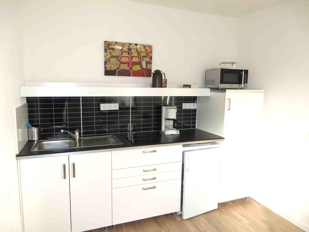 Küche voll ausgestattet mit Kühlschrank, Zwei-Platten Ceran-Kochfeld, Mikrowelle, Spüle, Geschirr und Besteck.